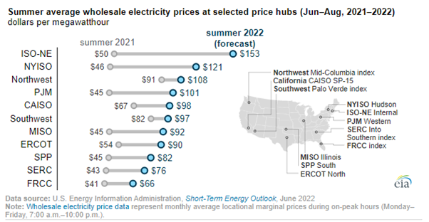 In its Short-Term Energy Outlook, published on 16 June the EIA forecasts that electricity prices in the Northeast regions (ISO New England, New York ISO, and PJM markets) will exceed $100/MWh between June and August 2022, up from an average of about $50/MWh last summer. Summer electricity prices are expected to average $98/MWh in California’s CAISO market and $90/MWh in the ERCOT market in Texas.